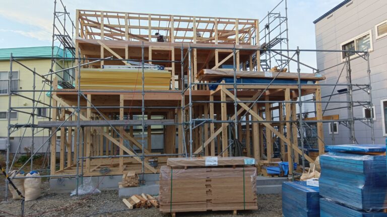 サイエンスホーム上棟です。 施工状況251106154433129 2025.11.07 こんにちは。山田です。青森市にて 着工中のサイエンスホーム組立と なり家の形が分かってきました。 柱はひのきとなってます。 251106154433129 完成1月で展示会予定です。