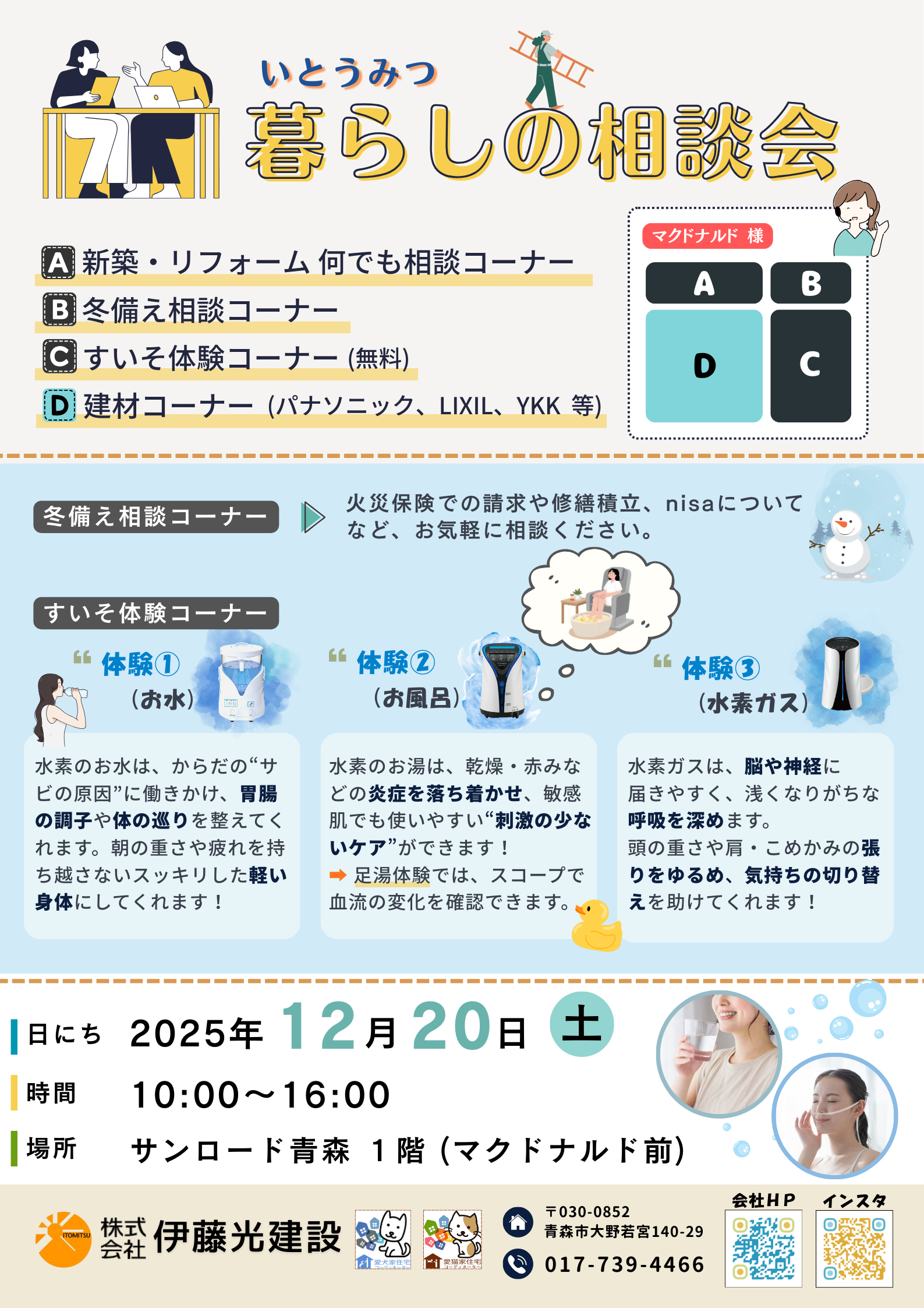 12月20日(土)サンロードイベント お知らせ 2025.12.13 こんにちは! 12月20日(土)サンロードイベント開催!! マクドナルド前で10時~16時迄 住宅に関するご相談はもちろん、 冬備え相談コーナーでは雪害に関すること・これからのお金の管理等 トータルライフコンサルタントをお呼びしております。 ぜひ遊びに来てください(^^♪