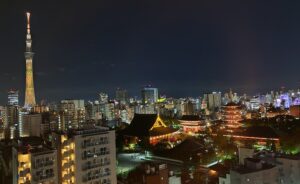 ホテルに着くとフロントの方から「ワンランク上のお部屋をご用意させて頂きました。」との事でワクワクしながら部屋へ入ると角部屋で一方の窓からはスカイツリーと浅草寺の全景が(奥にはアサヒビールの本社のう〇こビルも)、もう一方からは「花やしき」が見えました!