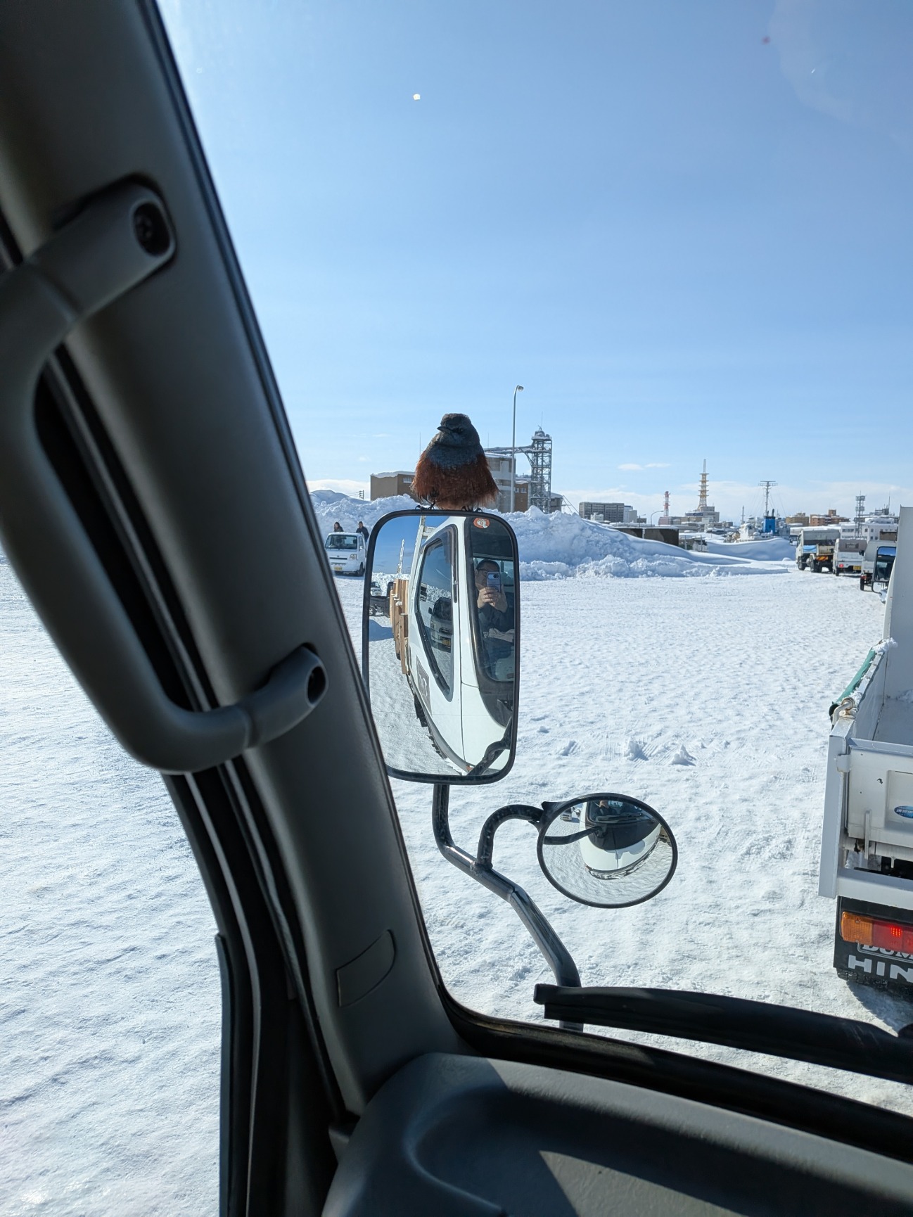 雪のせいで気分も殺伐としていますが・・・ 日々の出来事 2026.02.09 皆様こんにちは! 盛田です! 毎日毎日 雪のせいで恐怖と不安と心身ともに疲労の毎日ですね😢 そんな中先日排雪に行った際に雪を降ろしたトラックが行列をなして並んでいたところトラックのミラーに名前も知らない鳥が羽休めにとまりました! 少しだけ気持ちが明るくなりました!