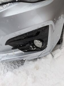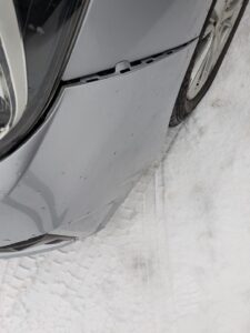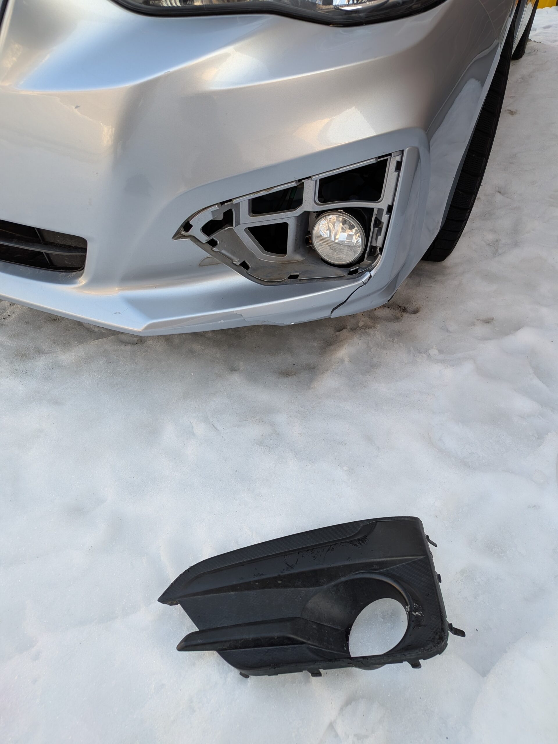 喜んでおりましたが高低差が半端なく、頑張ってツルハシで削りました。 我が家の駐車スペースに車を収めるにはお向かいさんの通路に頭を突っ込んでバックで入るのですが、勢いをつけないと入れないので思い切りバックしたらばその角に固い雪の塊があり、フロントのライトの黒いプロテクターが吹っ飛びました((^_^;))、バンパーも割れてずれてしまいました。 プロテクターは何とかハマりましたが、春先に修理しなければ(😢)