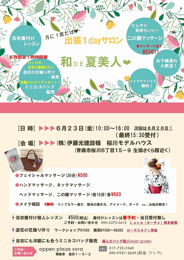 18 | 19 | 20 | 21 | 22 | 23 ○出張1dayエステサロン ○コサージュ&髪飾りワークショップ ○ゆかた着付け&帯結びレッスン |